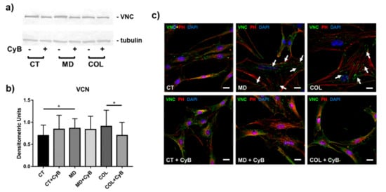 In order to understand whether MD or COL may represent a mechanical stimulation able to influence the ability of tenocytes to form focal adhesions, we analyzed the expression of VNC, a key protein involved in the formation of the adhesion plaque, by morphological and molecular methods. Western blot analysis showed that VNC protein levels were significantly up-regulated in cells grown on MD (MD vs. CT, p = 0.033) and tended to increase also in cells cultured on COL. In this experimental group, VNC was significantly decreased by CyB treatment (COL vs. COL+CyB, p = 0.040) (Figure 8a,b). The effects of the presence of the scaffold and of CyB administration were more evident using morphological analysis by immunofluorescence. Indeed, VNC immunoreactivity, localized at the extremities of actin filaments in correspondence with focal adhesion formation on the substrate, was found to be stronger and wider in tenocytes grown on MD and COL, compared to CT (Figure 8c). After CyB administration, the VNC immunofluorescence signal and the regions corresponding to the presence of the focal adhesion seemed less evident and smaller only in cells grown on MD and COL, but not in CT, becoming similar to CT (Figure 8c, arrows).
