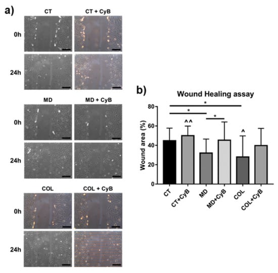 Cell migration, playing a key role during tendon healing, was assessed by a wound healing assay in tenocytes grown on CT, MD and COL with or without CyB administration. The quantification of the scratch size revealed that cell migration is significantly increased in tenocytes cultured on MD and COL, compared to CT (p = 0.023 and p = 0.032, respectively). Conversely, cell migration remained unaffected by CyB treatment in CT, but was strongly reduced in MD (MD vs. MD+CyB, p = 0.040) and, although not statistically significant, in COL tenocytes (COL vs. COL+CyB, p = 0.07) (Figure 9a,b). The ANOVA p value was 0.001 and the post-test confirmed the increased migration induced by COL compared to CT (p = 0.015) and revealed a significant increase in the migration of cells cultured on MD or COL compared to CT+CyB (p = 0.009 and p = 0.001, respectively).