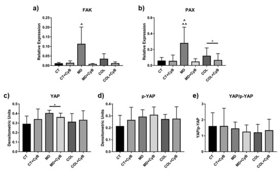 Bar graphs showing FAK (a) and PAX (b) mRNA levels after normalization on GAPDH gene expression. Data are means ± SD for at least two independent experiments. For YAP expression, the active-form YAP (c), the inactive phosphorylated form (d) and the YAP/p-YAP ratio (e) were assessed by Western blot and represented by the histograms showing mean ± SD for at least two independent experiments for the considered experimental groups. * p < 0.05 for t-test; ^ p < 0.05 vs. CT, CT+CyB, MD+CyB, COL+CyB; ^^ p < 0.01 vs. MD+CyB and COL+CyB using ANOVA.