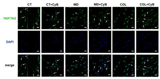 In order to understand whether MD or COL were able to trigger a mechanical stimulation in tenocytes, YAP/TAZ activation induced by the scaffold was investigated by analyzing their localization by immunofluorescence analysis. YAP/TAZ were expressed both in nuclei and the cytoplasm. We observed a stronger nuclear immunoreactivity in tenocytes cultured on MD and COL, compared to CT. In CT, CyB did not significantly modify this pattern of expression, whilst in tenocytes cultured on MD and COL, CyB strongly increased the number of nuclei having a less intense YAP/TAZ labeling (Figure 11): this finding suggests that mechanical stimulus deprivation following CyB administration inactivated YAP/TAZ and induced their translocation from the nucleus to the cytoplasm.