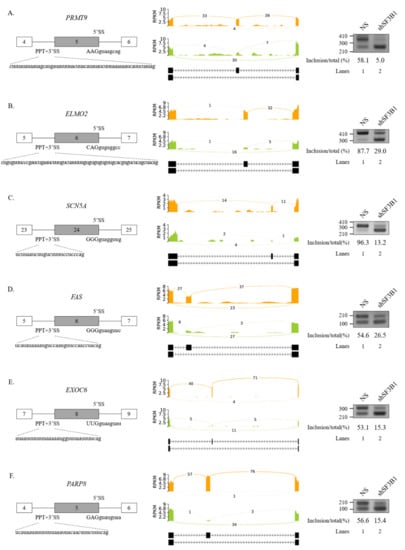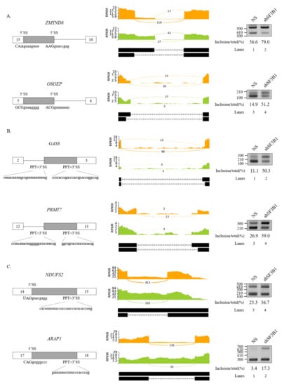 - Cho, S.; Moon, H.; Loh, T.J.; Jang, H.N.; Liu, Y.; Zhou, J.; Ohn, T.; Zheng, X.; Shen, H. Splicing inhibition of U2AF65 leads to alternative exon skipping. Proc. Natl. Acad. Sci. USA 2015, 112, 9926–9931. [Google Scholar] [CrossRef]