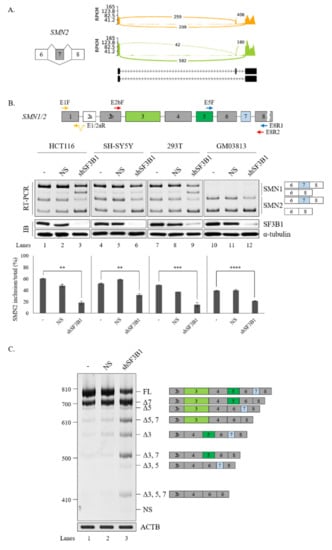 3.2. SF3B1 Regulates Cassette Exon Splicing of SMN1 and SMN2 Pre-mRNA