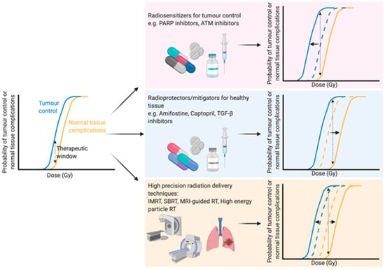 With an ever-aging population the number of people diagnosed with cancer is constantly growing []. Therefore, there is an even greater onus on the need to develop both current and new methods to enhance the efficacy of cancer treatments. Traditional cancer treatments, such as radiotherapy, chemotherapy and surgery, are still the most common modalities, but newer treatments such as immunotherapy are becoming more and more prevalent. Radiotherapy (either alone or in combination with surgery and/or chemotherapy) is used to treat over half of all cancer patients, with a curative intent in the majority of these cases [,]. Furthermore, the number of patients undergoing radiotherapy is predicted to increase even further due to an aging and growing population, as well as rapid technological advances in radiotherapy delivery practices []. The primary goal of radiotherapy, as with all other forms of cancer treatment, is to maximise the therapeutic window. The therapeutic window describes the balance between the probability of increasing tumour cell kill while minimising the probability of normal tissue complications. This can be achieved by using drugs which target the intrinsic vulnerabilities of a tumour to make it more susceptible than healthy tissue, or alternatively by physically targeting the tumour with greater accuracy and minimising the co-irradiated normal healthy tissue (Figure 1).