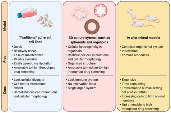 Organoids, three-dimensional in vitro structures derived from induced pluripotent stem cells, embryonic stem cells or tissue specific resident stem/progenitor cells [,], offer a “steppingstone” between more traditional in vitro cell lines and in vivo animal models. Organoids are self-assembling structures which resemble the tissue of origin [,,]. They contain multiple cell types [], overcoming the lack of cellular diversity of cell lines, although vasculature and endothelial cells are generally absent from these cultures. Distinct nomenclature has been proposed in some fields to distinguish between different 3D in vitro cultures, such as the suggested nomenclature differences between “enteroids”, “colonoids” and “organoids” in the gastrointestinal field []. Furthermore, the term “tumouroids” is frequently used for tumour-derived organoids (or tumour-like organoids). Therefore, it should be noted that here we use the term “organoids” to encompass all self-organising 3D cellular structures derived from embryonic stem cells, induced pluripotent stem cells or tissue-resident stem/progenitor cells which contain multiple different cell types found within the tissue of origin. This is based on the definitions proposed by Lancaster and Knoblich (2014) [] and Clevers (2016) [].