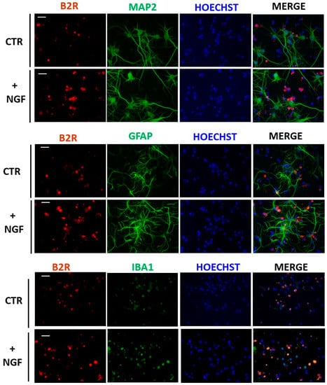 Furthermore, an immunofluorescence analysis of CNs revealed the exact localization of B2R in the basal condition after NGF treatment. As shown in Figure 3, a merged analysis indicated that B2R immunoreactivity was present in microglial cells (IBA1) in control conditions (CTR) and overexpressed after NGF treatment (+NGF). Conversely, no colocalization was detected in neurons (MAP2 cells) or astrocytes (GFAP cells).