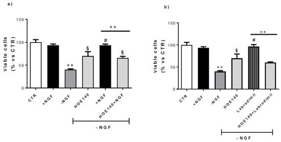 Effect of B2R antagonism on CN viability. At 10 DIV, CNs cultured in Neurobasal + 1% B27 (CTR) were treated for 48 h with NGF 100 ng/mL (+NGF) and afterwards deprived of NGF for 24 h by washing (−NGF) or rescued by 24 h NGF replacement (+NGF). Neuronal viability was determined by counting intact nuclei and expressed considering 100 as the number of viable neurons in CTR conditions. (a) Treatment with HOE140 (1 µM), a selective B2R antagonist, induced a considerable inhibitory effect on the neuroprotection promoted by NGF replacement (HOE140 +NGF). (b) In the same conditions, HOE140 significantly antagonized the neuroprotective activity exerted by RPM-7, a selective B2R agonist (RPM-7 (100 nM). Data represent means (±S.E.M.) from four duplicate experiments. Statistically significant differences were calculated by one-way analysis of variance (ANOVA) followed by Bonferroni’s test (** p < 0.01 versus +NGF; # p < 0.01 versus −NGF; § p < 0.01 versus −NGF).