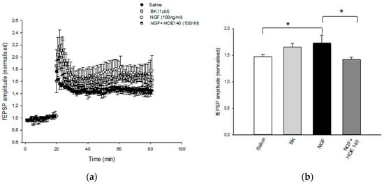 Electrophysiology recordings showed that pretreatment of hippocampal slices with NGF (100 ng/mL for 1 h) was able to significantly enhance LTP at CA1 hippocampal synapses (1.77 ± 0.18) compared to the control (1.45 ± 0.06) (Figure 6). Notably, the application of BK (1 µM for 1 h) mimicked the NGF-mediated facilitatory action on CA1-LTP (1.64 ± 0.06). The effect of NGF was prevented by the pretreatment of slices with the B2R antagonist HOE140 (100 nM) (1.4 ± 0.05), further suggesting that NGF modulates synaptic plasticity via interaction with B2R. These results indicate that B2R, endowed with neuroprotective activity, plays a role in the NGF mechanism of action.