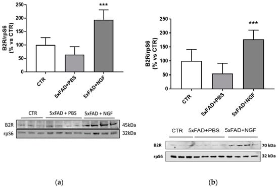 Overexpression of B2R by NGF treatment in 5xFAD brain extracts. Western blot analysis of B2R protein expression (panel (a) bands at 45 kDa; panel (b) bands at 70kDa) in brain extracts from wild type mice (CTR) and 5xFAD mice intranasally treated with PBS or NGF normalized against rpS6 and expressed as a percentage of the control (CTR). Data represent means (±S.E.M.) from four independent samples. Statistically significant differences were calculated by one-way analysis of variance (ANOVA) followed by Bonferroni’s test for multiple comparisons. (*** p < 0.001).