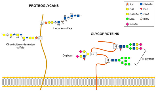 In contrast to N-linked glycosylation, O-glycosylation does not involve a lipid-linked oligosaccharide precursor for transfer to nascent polypeptides. Instead, it consists of the formation of a single glycosidic linkage between Ser or Thr residues and GalNAc, Man, Glc, Xyl, or Fuc [17]. The most abundant type of O-glycans are the mucins initiated by GalNAc-Ser/Thr and the glycosaminoglycan (GAG) chains on proteoglycans initiated by a conserved tetrasaccharide Glc-A-β1,3-Gal-β1.3-Gal-β1,4Xyl-β (Figure 1). Synthesis of O-glycans starts in the early cis-Golgi or in a translational compartment (ERGIC, with characteristics of the ER), and is completed via the sequential addition of glycans while the secretory protein moves through the cis-, medial- and trans-Golgi cisternae.