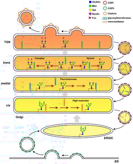 The enzymatic addition of glycans to proteins, dubbed “protein glycosylation”, is a fundamental post-translation and co-translational modification that controls the folding and stability of proteins and their transport through the secretory pathway [1,2,3]. The composite repertoire of glycan structures in glycoproteins impacts on many different cellular and developmental processes such as signal transduction, molecular trafficking, cell-cell communication, immunity and early mammalian development [4,5]. Since one fifth of all proteins in structural databases are classified as glycoproteins, it is not surprising that up to 2% of the eukaryotic proteome is required for glycosylation [3,6]. It has been estimated that 700 proteins are required to generate the glycan structures in human glycome [7]. Glycoprotein glycosylation is a sequential process that involves the coordinated action of hundreds of glycosyltransferases (GTs) and glycosydases, which are trafficked to the specific locations of the endoplasmic reticulum (ER) and Golgi apparatus [8]. Only ten monosaccharides are essential for the synthesis of animal glycans: glucose (Glc), galactose (Gal), N-acetylglucosamine (GlcNAc), N-acetylgalactosamine (GalNAc), fucose (Fuc), mannose (Man), xylose (Xyl), glucuronic acid (GlcA), sialic acid (SA, either as N-acetylneuraminic acid, Neu5Ac or 5-N-glycolylneuraminic acid acid, Neu5Gc). The main types of protein glycoprotein glycans are N- or O-linked. N-glycosylation starts in the ER with the synthesis of a glycan precursor with the composition Glc3Man9GlcNac2 on the carrier dolichol isoprenoid lipid [9]. The precursor glycan is then transferred en bloc onto asparagine residues of nascent proteins by multisubunit oligosaccharyltransferase (OST) complexes within the lumen of the ER [10,11,12]. Distal glucose moieties of the Glc3Man9GlcNac2 glycan are trimmed before reaching the Golgi apparatus by sequential actions of ER glucosidases, representing an important step in the control of folding processes for secretory pathway glycoproteins prior to ER exit [13,14,15]. Glycoproteins that exit the ER reach the Golgi apparatus with eight or nine mannose residues for further processing of the glycan moieties into complex and hybrid glycan forms (Figure 1).