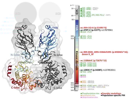 The structure of a CHK2 dimer (left; www.rscb.org/structure/3I6W) consists of intertwined monomers (one subunit is colored in gray, and the second subunit is colored in gradient from the N- to C-terminus; missing parts of 3D structures are colored in gray). The same color-coding of the bar (right) indicates the positions of conserved domains (boundaries reflect the crystallographic analysis by Cai et al. [35]). Lollipops depict known sites of covalent modifications, founder mutations, and variants.