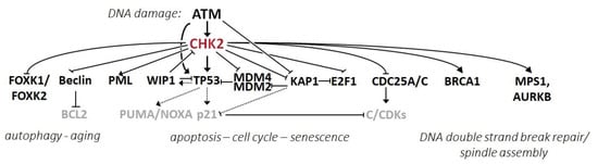 Once activated, CHK2 phosphorylates many intracellular targets carrying a consensus motif containing a hydrophobic amino acid (Bα) at position −5 and arginine (R) residue at position −3: Bα-X-R-X-X-S/T [68]. Activated CHK2 kinase then participates in the regulation of many intracellular pathways that were comprehensively reviewed by Zannini and colleagues [69]. Our review summarizes CHK2 activities related to the process of tumorigenesis.