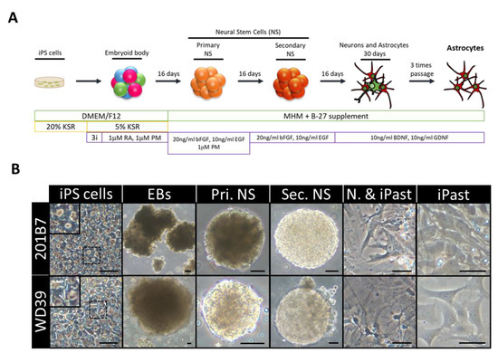 Induction of Human Astrocytes (iPasts). (A) Design of the human iPast induction protocol under serum free condition. Abbreviations: DMEM/F12: Dulbecco’s Modified Eagle Medium: Nutrient Mixture F-12; MHM: Media Hormone mix; B-27™: optimized serum-free supplement; KSR: KnockOut™ Serum Replacement; 3i: 3 µM CHIR99021, 3 µM 431542, 3 µM Dorsomorphine; RA: Retinoic acid; PM: Purmorphamine; bFGF (FGF-2): Basic fibroblast growth factor; EGF: Epidermal Growth Factor; BDNF: Brain-Derived Neurotrophic Factor; GDNF: Glial cell line-Derived Neurotrophic Factor. (B) Representative images of cells at each step of iPast induction process from the two iPSC control lines 201B7 and WD39. Abbreviations: EBs: Embryoid Bodies; Pri. NS: primary neurospheres; Sec. NS: secondary neurospheres; N. & iPasts: Neurons and iPasts; iPasts: human iPSC-derived astrocytes. The cells in the insets at iPSC stage are higher magnifications of cells in dashed boxes and indicative of good quality iPSCs with clear perinuclear halos. Scale bars: 50 µm (20 µm for iPast stage).