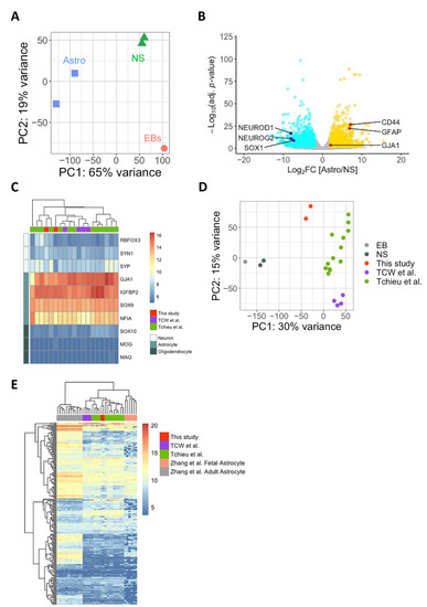 For RNA-Seq, RNA from EBs, neurospheres and iPasts were extracted using RNeasy kit (QIAGEN, Hilden, Germany). The indexed cDNA libraries were prepared using the Nextera XT library preparation kit (Illumina, Tokyo, Japan) and were sequenced using a NovaSeq6000 (Illumina) to obtain 150-bp paired-end reads. Published RNA-Seq data of primary astrocytes [7] and iPSC-derived astrocytes [22,23] were downloaded via the National Center for Biotechnology Information (NCBI) Short Read Archive (Supplemental Table S1). Raw FASTQ files were trimmed for adapters by Cutadapt [24] and aligned to the GRCh37 genome build using HISAT2 [25]. Counts were calculated using featureCounts [26] and normalized by variance-stabilizing transformation using the DESeq2 [27]. Differentially expressed genes were identified using a cutoff of 0.01 for Benjamini-Hochberg adjusted p-values and a cutoff of 4 for fold-change ratio. A comparative analysis of our dataset with fetal and adult astrocytes was performed across a set of astrocyte-specific genes used in Tchieu et al. [23] (Supplemental Table S2). The RNA-Seq dataset including raw data and preprocessed data has been deposited in the NCBI Gene Expression Omnibus and is accessible through GEO series accession number GSE161024.
