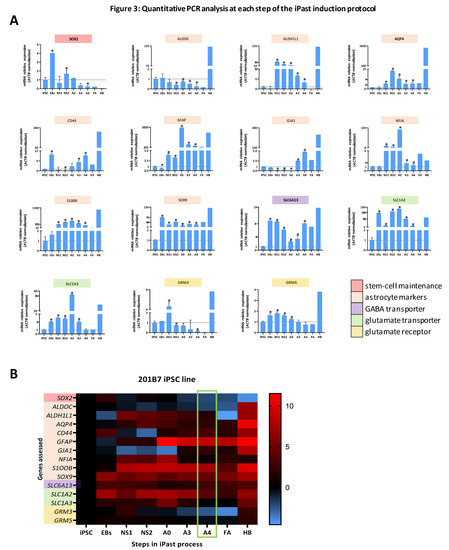 Longitudinal Analysis by Quantitative PCR During iPast Induction Protocol. (A) Quantitative real-time polymerase chain reaction of indicated markers in cells derived from the 201B7 iPSC line. Markers are arranged by family according to the indicated color code (stem-cell maintenance, astrocyte markers, GABA transporter, glutamate transporters and receptors). FA stands for control fetal astrocytes and HB for human brain. Values are normalized to ACTB quantification and represent the fold change ratio value relative to iPSC value. n = 3 passages in duplicate. Data shown are mean ± SEM. Statistical test used: Wilcoxon Matched-pairs test. * indicates p-value ≤ 0.05 (B) Heatmap summing up gene transcription by quantitative RT-PCR in A. iPasts A4 status is highlighted by the green box. Values are logarithm to base 2 of fold changes from A.