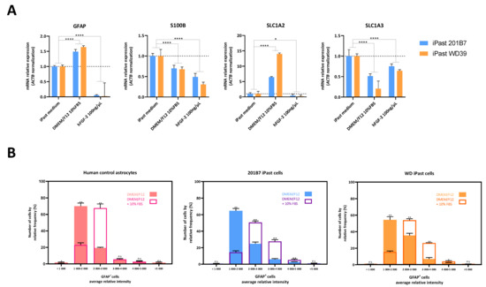 To investigate the capacity of iPasts to turn from quiescent to reactive astrocytes, we questioned the effect of culture medium regarding the transcription of key genes of the astrocytic lineage. Therefore, we compared the influence of our differentiation medium (iPast medium) vs. DMEM/F12 supplemented with 10% FBS or 100 ng/µL FGF-2 on the transcription of GFAP, S100B, SLC1A2 and SLC1A3 in iPasts (Figure 5A). When cultured with FGF-2, iPasts showed a reduced transcription of these four genes. Regarding GFAP, this result is consistent with previous work showing that FGF-2 decreases astrocyte activation by reducing the level of GFAP expression [49]. Conversely, iPasts cultured with FBS showed an increased transcription of GFAP and SLC1A2, genes associated with the status of activated mature astrocytes but had fewer transcripts for S100B and SLC1A3 than iPasts grown in our medium. Using automatic image analysis by IN Cell Analyzer, we analyzed the distribution of GFAP+-iPasts depending on the individual mean GFAP intensity. iPasts were cultured in iPast medium or in the presence of 10% FBS and human fetal astrocytes cell culture (FAC) were used as positive control (Figure 5B). iPasts were classified into six classes of GFAP-fluorescence. Our data confirmed that culture in 10% FBS induced a significant shift toward a higher GFAP-immunofluorescence in the three sources of astrocytes examined.