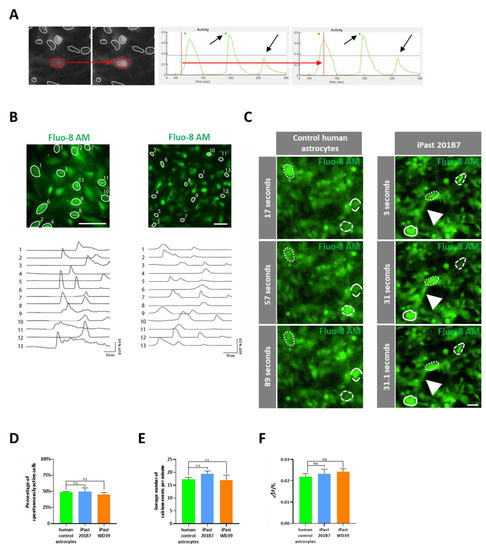 Based on recent reports which underscored the importance of calcium levels in astrocytes to modulate neuronal functionality [50,51], in order to elucidate the functionality of iPasts, we first investigated astrocytic calcium signaling, indicative of the intercellular communication network between astrocytes [52,53,54]. To monitor calcium dynamics, we performed calcium imaging using Fluo-8 AM, a calcium indicator that has twice the fluorescence intensity of Fluo-4 AM. Image analysis was performed with custom scripts based on MIN1PIPE [28] to facilitate semi-automated detection and analysis of calcium dynamics in astrocyte (Figure 6A). iPasts displayed spontaneous and periodic calcium transients, as observed in control human FA (Figure 6B, Figure S2H and Supplementary movie 1). This result is in favor of an astrocytic phenotype, given that neuronal calcium activity is much faster. The calcium activity could be observed both in the soma and processes of astrocytes (Figure 6C). There were no differences in the percentage of spontaneously active cells (Figure 6D), the number of calcium events per minute (Figure 6E) and the amplitude of calcium events (Figure 6F) between the human control astrocytes and iPasts. These data imply that iPasts exhibit calcium dynamics features similar to primary human fetal astrocytes.