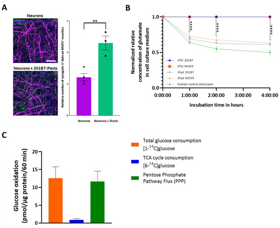 In connection with the high expression in iPasts of SLC1A2 glutamate transporter (Figure 4E), which contributes to ~90% of glutamate uptake by astrocytes [45] and because glutamate clearance from the synaptic cleft terminates glutamatergic transmission in vivo and prevents glutamatergic excitotoxicity, we next assessed whether iPasts could uptake glutamate. Using the starting iPSC lines as negative controls and the human astrocyte line as a positive control, we exposed iPasts to 250 µM of glutamate and quantified the glutamate uptake one, two and four hours after the incorporation of glutamate (Figure 7B). Our experiments demonstrated that iPasts were capable of taking up glutamate in a time-dependent manner and in the same order of magnitude that the human fetal control astrocytes, in contrast with the starting iPSC lines.