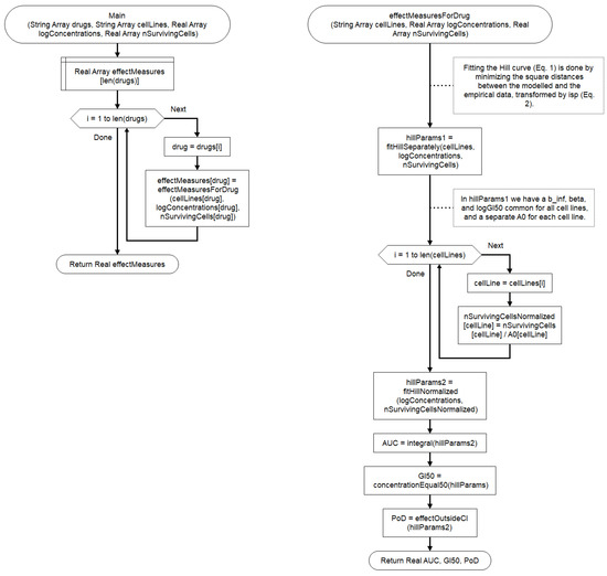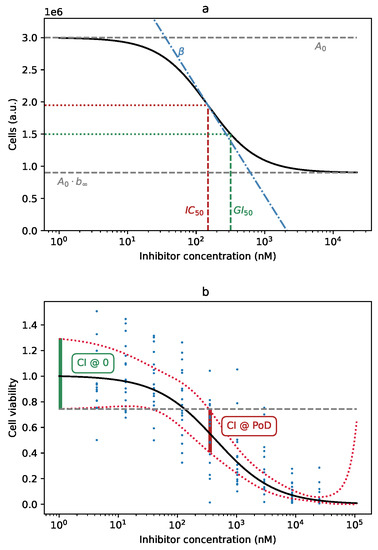 Chemotherapy effects on cancer cells are measured using various methods depending on the biological question [6,7]. In modern throughput campaigns, the use of bioenergetic quantification [8] is established as a reliable sensitive method to report the anti-cell growth potential of drugs. Multiple methods of expressing the effectiveness of a drug in in vitro experiments are common in practice. Assuming a drug shows an effect, its potency will depend on the drug concentration. The dependency between the concentration and the effect is commonly modeled by the Hill equation [9,10,11]. In its simplest form, when it is used to model cell viability in a drug solution and when the viability is known to span the range 0–1 (in percentage: 0–100%), it is a logistic function over the logarithm of the drug concentration and is fully determined by two parameters, the slope and the x-offset. When the y-range of the curve is different, e.g., because it is used to model the absolute number of surviving cells (or its correlate, but in any case, a value that can be much larger than one) and never falls to zero (because a fraction of cells survive even in the saturated solution), two additional parameters are required. They determine the upper and the lower bound of the curve. There are multiple, equivalent ways of writing this four-parameter equation. In this study, we use the following form, where its relationship with the common logistic function is more apparent and whose parameters are readily interpretable: