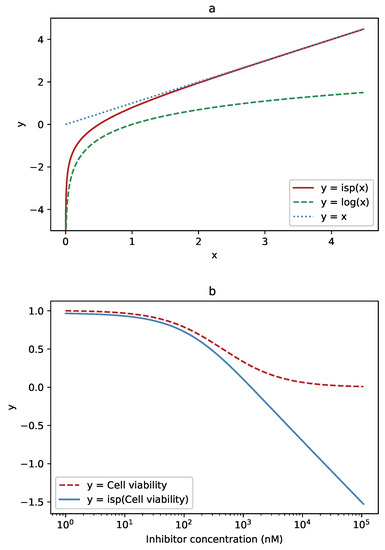 has the convenient property of being close to linear for large x and close to logarithmic near (Figure 2a). Applied to the Hill curve, it leaves large values mostly unchanged, but straightens its exponentially decreasing tail towards a straight line (Figure 2b). The transition between the two is smooth, and the dominant behavior at the value x depends on the scaling factor s.