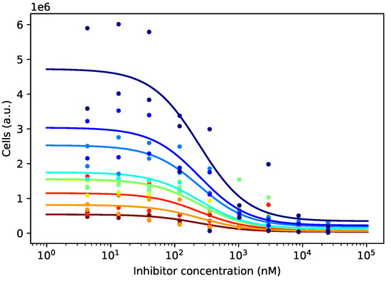 For each candidate substance, we fitted the four-parameter Hill curve. Since the starting cell concentrations differed for different cell lines, we first needed to normalize the empirical cell numbers so that the corresponding curves started from the same reference point. To that end, we fitted a curve for each cell line, having its individual amplitude , but sharing the remaining three parameters with the other cell lines. This ensured that the curves shared an identical shape, irrespective of the cell line, and differed only in their height (Figure 3). The fitting was performed by the ordinary least-squares procedure on the raw data.