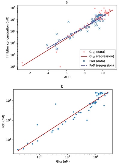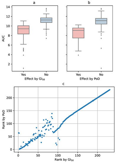 Using GI as the criterion, AUC had a significantly higher value (t-test, ) when no effect could be observed than when GI had a finite value (mean vs. mean ; Figure 6a). When PoD was taken as the criterion, the result was similar, only with slightly shifted AUC values (mean vs. mean , ; Figure 6b). This suggests that a threshold on AUC can be defined (for our set of drugs and tested concentrations: between and 10), so that the AUC with a value above it would also indicate the lack of an effect of the tested drug.