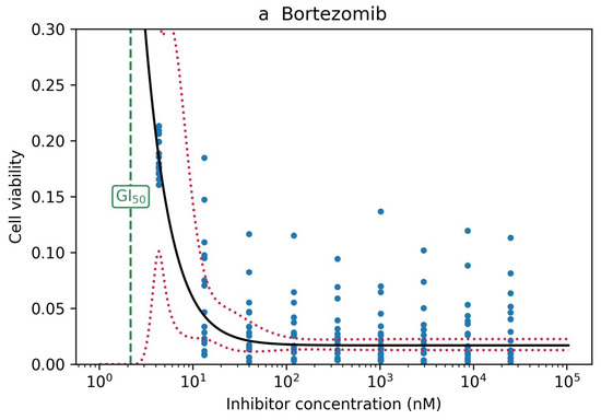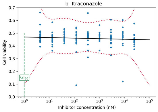 Ranking of the drugs by their effectiveness was not identical, but highly similar for GI and PoD as criteria, at least for the top-ranking substances (Figure 6c). Among the top 20 drugs ranked by GI were also 16 of the top 20 drugs ranked by PoD and 19 of the top 20 drugs ranked by the AUC (Table 1). Interestingly, two drugs ranked 1 and 2 by GI, itraconazole and bortezomib, never reached a PoD. For bortezomib, it is obviously a regression issue: The drug is so effective that it causes low cell viability even at low concentrations, for which we did not perform any measurements. Consequently, the confidence interval at such low concentrations turned out to be very wide (Figure 7a). For itraconazole, the issue was the opposite: the drug is obviously ineffective (Figure 7b), and the numerical fitting algorithm did not converge to a reasonable set of parameters.