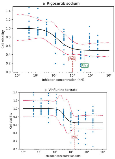 Conversely, among the top 20 drugs ranked by PoD were 16 of the top 20 drugs ranked by GI and 16 of the top 20 drugs ranked by AUC (Table 2). Here, no effect was detected for vinflunine tartrate (Rank 18) when using GI as the criterion. The drugs actually showed an effect at low concentrations, but it leveled off above 50% viability, so that GI was never reached. Rigosertib sodium (Rank 15 by PoD and 24 by GI) showed a similar behavior, but leveled off shortly after falling below 50% (Figure 8).