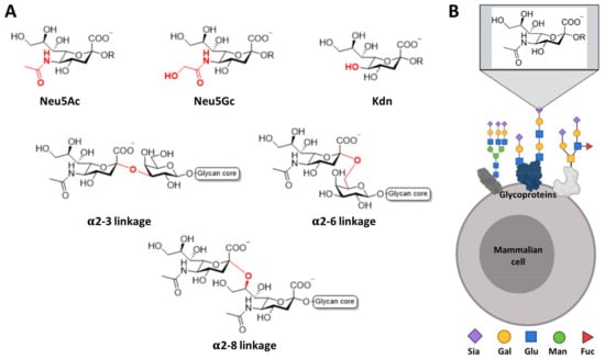 Most common sialic acids in mammals. (A) Chemical representation of the most common type of sialic acids in mammals and their linkage to the subterminal glycan. (B) Sialic acids are found at the outer most exposed non-reducing end of glycan chains on glycoproteins or glycolipids on the cell surface.