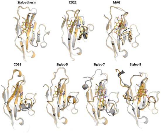 Superposition of the unliganded (grey) and liganded (orange) structures of d1 from Sialoadhesin (PDB ID: 1QFP and 1QFO), CD22 (PDB ID: 5VKJ and 5VKM), MAG (PDB ID: 5LFR and 5LF5), CD33 (PDB ID: 5IHB and 5J06), Siglec-5 (PDB ID: 2ZG2 and 2ZG3), Siglec-7 (PDB ID: 1O7S and 2HRL) and Siglec-8 (PDB ID: 2N7A and 2N7B).