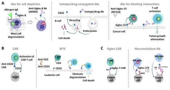 Antibody based molecules targeting Siglecs. (A) mAbs against Siglecs. (Left) Anti Siglec-8-Ab, such as AK002, deplete eosinophil activation and mast cell degranulation upon binding. (Middle) Isotope/drug conjugated Abs targeting CD22 on B cells are endocyted and can deliver the isotope or drug at the cytoplasm to allow cell killing. (Right) Anti-Siglec-15 Abs (e.g., NC318) can block interaction of cancer cells expressing Siglec-15 and T cells. (B) Targeting Siglecs with chimeric antigen receptors (CARs) and bi-specific Abs. (Left) CAR-T cells targeting CD22 have being designed to specifically target and kill malignant B cells. (Right) The bi-specific T-cell engaging Ab (BITE) targeting CD33 and CD3 on the surface of T cells is able to activate a cytotoxic response against leukemic cells without requiring the prior activation of T cells. (C) Targeting cancer-associated glycans of tumor cells. (Left) Siglec-7/-9 derived CAR T-cells can recognize and kill cancer cells through binding to sialylated glycans. (Right) The tumor-targeted mAbs against HER2 fused with neuraminidase, is able to degrade Siglec-7/9 ligands and restore the immune cell response.