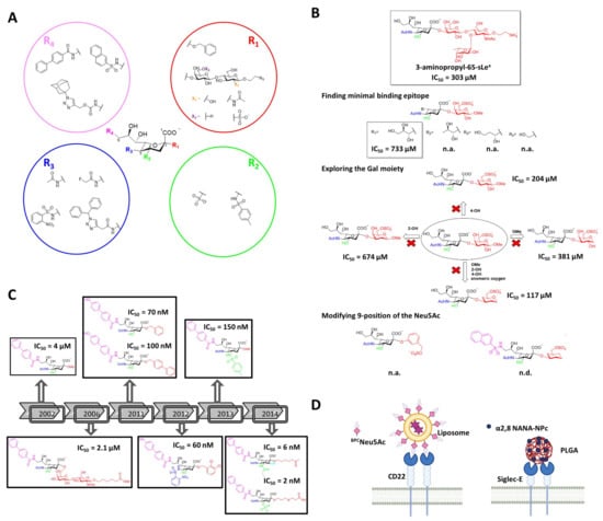 Chemically modified glycans are drug-like compounds that mimic the structure and function of native glycans, but impart improved affinities, bioavailability and longer serum half-lives []. Siglec targeting modified glycans are based on synthetically modified sialic acid scaffolds. These compounds need increased potency for binding at the binding groove masked by the endogenous cis glycans on the target cells. Except for the carboxylic C1 position, which is essential for binding to Siglecs, the rest of the scaffold ranging from C2 to C9 can be potentially modified (Figure 7).