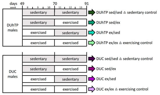 All in vivo experiments were conducted according to national and international guidelines and approved by our internal institutional review board. This study used mice selected from a broad genetic base population for high treadmill performance (DUhTP) over 140 generations [24,25] and unselected controls (DUC). Both mouse lines represent non-inbred lines, maintained by avoiding inbreeding. The animals were kept in H-Temp Polysulfon cages with a floor area of 370 cm2 (Eurostandard Type II, Tecniplast, Hohenpeißenberg, Germany) under controlled, specified pathogen-free (SPF) conditions. The mice were given fresh tap water and were fed autoclaved Ssniff® M-Z feed (Ssniff-Spezialdiäten GmbH, Soest, Germany) ad libitum. Weekly feed intake and body weight development were monitored for 42 days in 7- to 13-week-old mice as described [24]. For the study, male full-sib animals kept in single cages from day 21 were divided into four groups (n = 8) at the age of 48 days and assigned to an individual voluntary exercise program (Figure 1). The animals of the sedentary control group were kept in individual cages for six weeks without any treatment (sed/sed). Whereas, the exercising control group had six weeks of access to a running wheel (Conventional Activity Wheel, diameter = 33.4 cm, equipped with a counter that recognized every quarter rotation; Tecniplast) in their cages (ex/ex). In a cross-over study design, the wheels were removed from one experimental group (ex/sed) after three weeks and placed in the cages of another experimental group that spent three weeks sedentary (sed/ex). Accordingly, groups sed/ex and ex/sed were sedentary in the first or in the second half of the six-week study period. The animals could use the wheel at will, and voluntary physical activity was determined based on running wheel activity (quarter rounds per day). The individual activity was monitored, whereby one complete rotation of the wheel (diameter = 33.4 cm) corresponded to a running distance of 1 m.