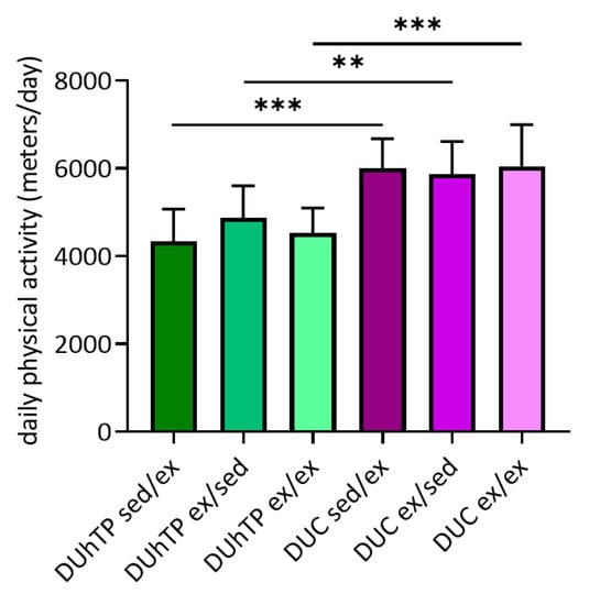 The voluntary activity of each animal was recorded daily, and the average physical activity of the active groups was determined. The animals’ age and voluntary physical activity duration did not influence weekly or 3-weeks running performance (data not shown). However, line-specific differences were visible. While the groups DUhTP sed/ex, ex/sed, and ex/ex covered 4340 ± 737, 4877 ± 729, and 4530 ± 565 m per day, respectively, DUC sed/ex, ex/sed, and ex/ex mice ran 6002 ± 673, 5869 ± 745, 6051 ± 950 m per day (Figure 2). Accordingly, the DUC mice were characterized by a significantly higher voluntary running activity than the DUhTP mice (p < 0.005).