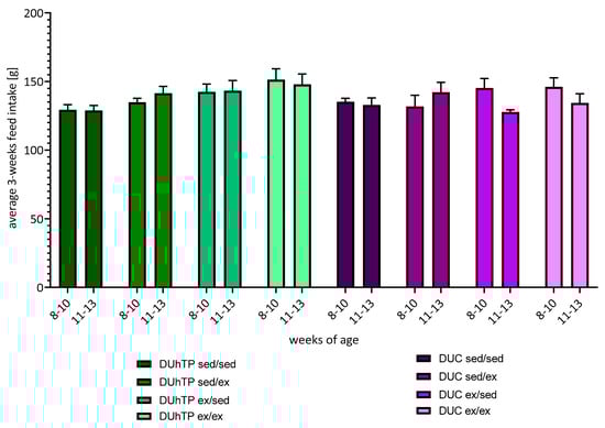 Within the first three weeks of the study, the body weights of sedentary DUhTP and DUC animals (sed/sed and sed/ex) increased to a greater extent than those of the animals, which had the opportunity to be physically active in a running wheel (ex/sed and ex/ex). A steady increase in body weight of about 3% per week was observed in the DUC sedentary controls. In contrast, the DUhTP sedentary controls increased significantly in weight, especially in the first two weeks (sed/sed: week 7–8: +9.9%, p < 0.0001; week 8–9: +5.9%, p < 0.05). After that, weight increased less from week to week but differed significantly between the beginning and the end of the 3-week interval (p < 0.005).