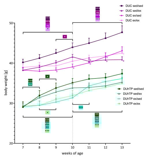 Effects of different exercise programs on body mass in DUhTP and DUC mice. Both lines’ animals were randomly attributed to four groups and individually kept with (ex) or without running wheel (sed) from week 8 to 10 or 11 to 13. The animals were weighed weekly, and the mean body mass ± SEM from eight animals per group are provided. Statistical analysis was performed by two-way ANOVA. Significance between two age points within one exercise group is depicted by a bracket, * p < 0.05, ** p < 0.005, *** p < 0.0005, ns, not significant; # p < 0.05 relative to respective sed/sed group at the same age.