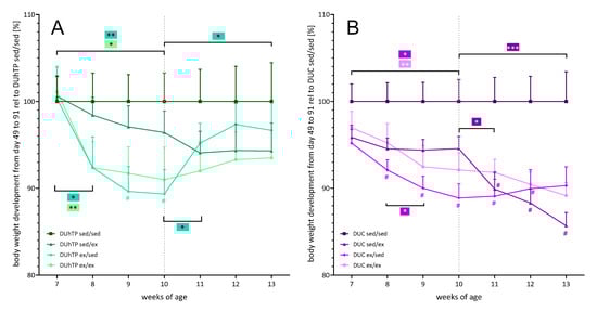 The relative weekly body weight developments of (A) DUhTP and (B) DUC animals with (ex) or without running wheels (sed) in the cage from week 8 to 10 or 11 to 13, by relating the body masses of the inactive control animals 100% and the determined body masses of the other groups. The body weights from eight animals per group ± SEM are provided. Statistical analysis was performed by two-way ANOVA. Significant differences between two age points within one exercise groups are depicted by brackets and color codes; * p < 0.05, ** p < 0.005, *** p < 0.0005; # p < 0.05 relative to the respective sed/sed group at the same age.