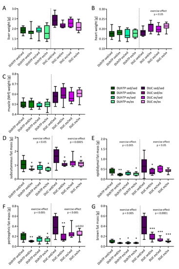 Absolute organ and tissue weights at week 13 of age in DUhTP and DUC mice in response to different activity programs. Both lines’ animals were attributed to four groups and individually kept from week 8 to 10 or 11 to 13, either with or without a running wheel. The absolut weights from (A) liver, (B) heart, and (C) muscle, as well as (D) subcutaneous, (E) epididymal, (F) perinephric, and (G) brown fat are presented as means ± SEM from eight animals per group. Statistical analysis was performed by two-way ANOVA. Significant effects of activity compared to the respective sedentary control as marked; * p < 0.05, ** p < 0.005, *** p < 0.0005. The overall effects of exercise are also stated.