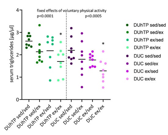 Robust effects of voluntary activity were observed on the fat depot weights (Figure 6D–G). In both genetic groups, voluntary activity, as a rule, decreased the weights of all fat depots examined (p < 0.05). In subcutaneous fat from DUhTP mice, six weeks of voluntary exercise led to reductions of 35% (ex/ex, p < 0.05), and three weeks of exercise in the second activity period resulted in a reduction of fat mass by 32% (sed/ex, p < 0.05) compared to the sedentary control group (sed/sed). Similar effects of physical activity were found in DUC mice with reductions of 30.9% (ex/ex, p < 0.05) and 33.6% (sed/ex, p < 0.05; Figure 6D). Also, significant effects were observed in epididymal, perinephric, and brown fat depots (Figure 6E–G), where voluntary physical activity decreased fat mass by up to 75%. In response to physical activity, serum concentrations of triglycerides were also decreased in both lines, however, to a significant extent only after six weeks of voluntary exercise (p < 0.05, Figure 7). In general, exercise significantly affected serum triglyceride levels in both lines (p < 0.0005).