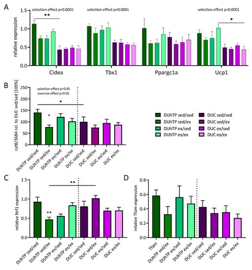 In our study, a positive correlation between Ppargc1a and Cyc and Cytb, subunits of the respiratory chain complexes, was detectable in DUhTP animals in response to exercise, with a stronger correlation in mice that exercised until the end of the experiment. Nevertheless, no altered gene expression of the investigated complex subunits could be shown in response to any exercise program. By contrast, a selection-mediated increase in Cytb and Cox4i1 gene expression was identified, which was also visible in elevated mitochondrial DNA in DUhTP compared to DUC mice. Three weeks of exercise reduced the mitochondrial DNA (ratio Cytb/36B4) content in DUhTP sed/ex mice. Notably, this reduced mitochondrial DNA was accompanied by decreased gene expression of the transcription factor Nrf1, which allowed direct identification of possible mediators of the negative effects of physical activity on subcutaneous fat energy expenditure. NRF1 induces the transcription of mitochondrial genes encoded in the nucleus and the transcription factor Tfam, which in turn is responsible for the expression of mitochondria-encoded genes [45,46]. NRF1 binds to the promoter of Cyc but not to the promoter of the Cox4i1 gene [47]. Its transcription is induced by NRF2 binding, which we have not investigated in this study. While Nrf1 expression did not correlate with either Ppargc1a, Tfam, or Cyc expression in either line, a positive correlation between Ppargc1a and Tfam was observed in exercised DUhTP animals. Accordingly, neither reduced Nrf1 expression nor reduced mitochondrial DNA levels were correlated with the altered expression of respiratory chain subunits.