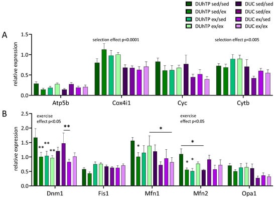 Analysis of mRNA expression in subcutaneous fat of 13-week-old DUhTP and DUC mice in response to different activity programs, determined by quantitative real-time PCR. The graphs show the relative expression (relative to the expression of the measured household genes) of genes related to (A) oxidative phosphorylation and (B) mitochondrial dynamics (fusion and cleavage). Statistical analysis was performed by two-way ANOVA. The graphs show the mean values (n = 8) with SEM. Significant effects of voluntary activity compared to the respective sedentary control, indicated by * p < 0.05, ** p < 0.005. Significant differences between two groups are indicated by a line over the bars and * p < 0.05 or ** p < 0.005. The main effects of selection and exercise in DUhTP are also shown in the graphs.