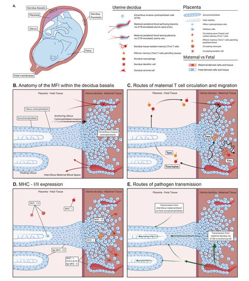 Gross and cellular anatomy of the maternal–fetal interface. (A) Gross anatomy of a fetus in utero. Placenta is colored purple to illustrate the maternal uterine (rose) and fetal (blue) tissues intermingling. The region where the placenta anchors to the uterus becomes the decidua basalis; where the fetal membranes contact the remaining surface of the uterus is the decidua parietalis. (B) Basic cellular anatomy of the maternal–fetal interface illustrating the fetal cells of the placenta (blue) invading the uterus (rose) and the maternal peripheral blood (light rose) bathing the placental villi. (C) Different maternal T cell populations patrolling complementary regions for antigen; intervillous blood space versus decidua. Black arrows indicate routes of surveillance. (D) Varied MHC-I and -II expression by maternal and fetal cells. (E) Possible routes of pathogen transmission (green arrows) from mother to fetus. Figure created with BioRender.com.