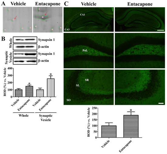 Synapsin I, a presynaptic marker protein, acts as a modulator of neurotransmitter release and synaptic vesicles [71], and inhibition of synapsin I decreased activity of both excitatory and inhibitory synapses in hippocampal cells [72]. Knockout of all synapsins showed lower serotonin levels in the hippocampus and behavioral dysfunctions [73]. Neurodegenerative diseases involve synaptic dysfunction, and synapsin I was significantly decreased in plasma neuronal-derived exosomes of Alzheimer’s disease patients [74]. In the present study, we observed synapsin I immunoreactivity in the stratum lucidum of the hippocampal CA3 regions and mossy fibers in the dentate gyrus, and synapsin I expression was significantly elevated after entacapone treatment.