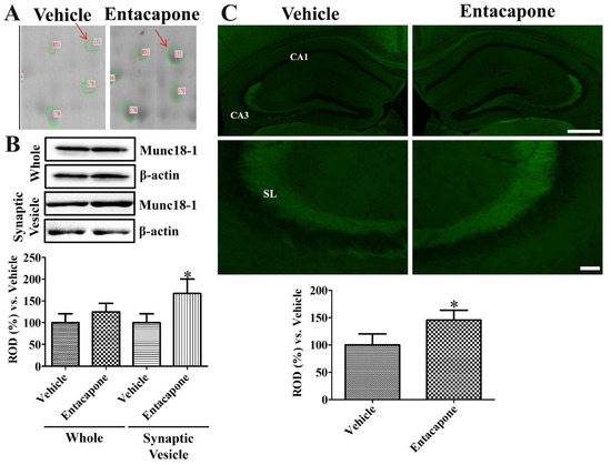 Munc18-1 expression in the hippocampus of vehicle- and entacapone-treated groups based on proteomic (A), western blot (B), and immunohistochemical (C) study. Munc18-1 was detected in a single spot. Munc18-1 protein levels were not significantly different between the hippocampi of vehicle- and entacapone-treated groups, while protein levels are significantly increased in the synaptic vesicle fraction of entacapone-treated group compared to that in the control group. Relative optical density in the entacapone-treated group versus that in the vehicle-treated group is shown in percentages for western blot analysis (* p < 0.05, significantly different from the vehicle-treated group). Western blot assays were performed in at least triplicate and bar graph represents the mean ± standard deviation. Munc18-1 immunoreactivity is observed in the stratum lucidum (SL) of CA3 region. Scale bar = 400 μm (low magnification), 50 μm (high magnification). Three sections, 150 μm apart, are selected between 1.7 and 2.3 mm caudal to the bregma in each animal. Relative optical densities (ROD) are expressed as a percentage of the value of Munc18-1 protein levels and immunoreactivity in the vehicle-treated group (n = 5 in each group; * p < 0.05, significantly different from the vehicle-treated group). The bars indicate the mean values ± standard deviation.