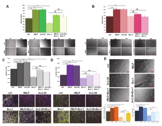 Another aspect considered was the in vitro angiogenesis on HUVEC cells. These cells showed a higher tendency to form capillary-like structures when treated with Ac2-26 and fMLP to a greater extent than the control cells. Additionally, Boc-1 has the ability to influence angiogenic activity negatively, with or without treatment (Figure 2E). These events have been further corroborated by the analysis of the number of branching points and the relative tube length calculated as reported in Section 2.