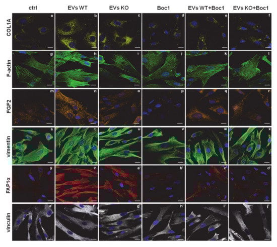 The tumor microenvironment could have relevant effects on PC aggressiveness and on the development of a malignant phenotype of cancer cells [44,45]. In this scenario, fibroblasts can differentiate into myofibroblasts, forming a tumor-responsive stroma, under the effects of soluble factors and exosomes produced by tumor cells [46]. In order to investigate this switch, we analyzed some of the principal mesenchymal markers. In Figure 5, BJ cells showed a notable increase of expression levels of FAP1α, collagen type I alpha1 (COL1A) and fibroblasts growth factor 2 (FGF2) when treated with EVs from WT MIA PaCa-2 than when treated with ANXA1 KO EVs (panels y-a’, a-c and m-o, respectively). In the presence of Boc-1, the levels of these proteins appeared strongly reduced (panels b’, d, p, respectively). When this antagonist has been administered together with ANXA1 KO EVs, the signal for these markers became very similar to the untreated cells (panels d’, e and q, respectively), while an intermediate intensity was revealed in the case of Boc-1/WT EVs (panels c’, d, and p).