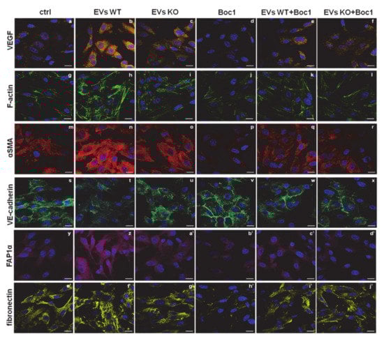 In Figure 6, in the presence of WT EVs, HUVEC disclosed a greater expression of vascular endothelial growth factor (VEGF), α-smooth muscle actin (αSMA), FAP1α, and fibronectin (panels a–b, m–n, y–z, and e’–f’, respectively), considered altogether as markers of EndMT [32,36]. Furthermore, the expression of these proteins underwent a smaller increase in the presence of EVs from ANXA1 KO clones (panels c, o, a’, g’, respectively). Accordingly, Boc-1 was more effective when FPRs were stimulated by WT EVs than by ANXA1 KO (panels d–f, p–r, b’–d’, h’–j’, respectively, for VEGF, αSMA, FAP1α, fibronectin). Again, vascular endothelial (VE)-cadherin showed an increased cytosolic expression with WT EVs than with ANXA1 KO EVs; Boc-1 blocked these effects and the protein remained linked to cell membrane despite the vesicles’ stimulation (panels s–x). Finally, the phalloidin staining allowed us to show the F-actin fibers more sharply with WT EVs compared to ANXA1 KO EVs. The intermediate behavior for each related treatment was reached in the presence of the FPR antagonist, as for the other markers considered (panels g–l).