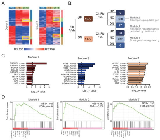 We compared transcriptome changes induced by vehicle, fibrinogen, and citrullinated fibrinogen treatments on CD14+ sorted monocytes between two healthy human donors. First, we found 4127 genes significantly changed by fibrinogen compared to vehicle. This is shown as a heatmap including a group treated with citrullinated fibrinogen for each donor (Figure 2A). Using K-means clustering analysis, we found four distinguished gene sets among the fibrinogen-upregulated or -downregulated genes in each donor that had reversed patterns of gene expression with citrullinated fibrinogen (Figure 2A, yellow boxes). Based on the genes with a concordant pattern of expression between donors 1 and 2, we classified 1072 genes as significantly upregulated and 1172 genes as significantly downregulated (Figure 2B). Fibrinogen-upregulated and -downregulated genes were further classified by three modules according to the responsiveness to citrullination. Module 1 (n = 660) included the genes upregulated by fibrinogen and not affected by citrullination; module 2 (n = 130) included the genes upregulated or downregulated by fibrinogen but reversed significantly by citrullination; and module 3 (n = 937) included the genes downregulated by fibrinogen and not affected by citrullination. No gene significantly changed by fibrinogen was concordantly up- or downregulated by citrullination. Therefore, module 2 was the gene set with expression that was reactive to fibrinogen but perturbed by citrullination.