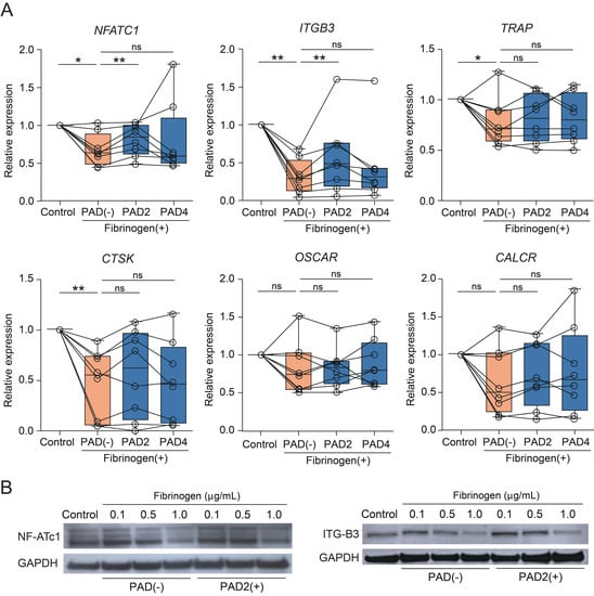 Gene and protein expression in osteoclasts in the presence of PAD. (A) Real-time PCR of cells cultured in the absence or presence of PAD2 or PAD4 at a dose of 1.0 μg/mL (n = 8). * p < 0.05; ** p < 0.01; ns—not significant. Individual values are plotted, and error bars represent SD. (B) Western blot of NF-ATc1, β3-integrin, and GAPDH. M-CSF and RANKL were supplemented in the control group.