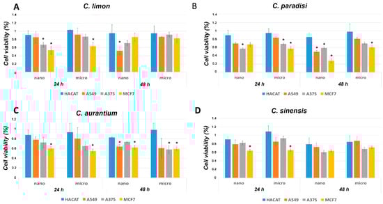 Citrus-derived nano and microvesicles reduce cancer cell proliferation. Cell growth was measured by MTT assay after 24 h and 48 h incubation with 25 μg/mL (expressed in protein content) of nano- and microvesicles isolated from the fruit juices of the following Citrus species: (A) C. limon, (B) C. paradisi, (C) C aurantium and (D) C. sinensis. The values were plotted as fold changes concerning related mock-treated cells (100% viable). Each point represents the mean ± SD of three independent experiments. Asterisks denote statistically significant values in comparison to non-tumour cells (HaCaT) assessed by t-test (* p ≤ 0.05).
